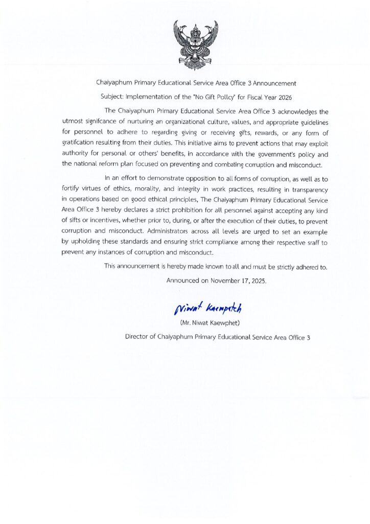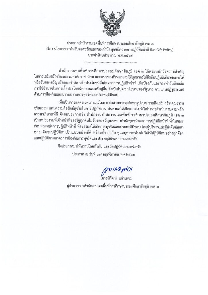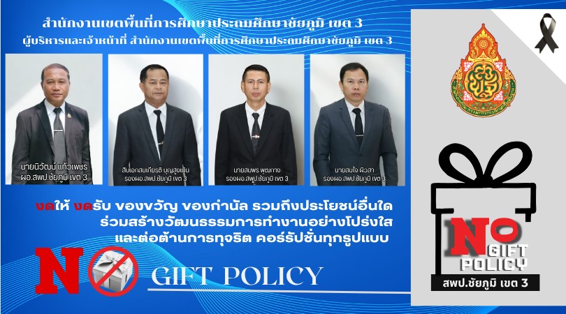 ประกาศเจตนารมย์และการสร้างวัฒนธรรม ตามนโยบาย No Gift Policy จากการปฏิบัติหน้าที่ ประกาศเจตนารมย์และการสร้างวัฒนธรรม ตามนโยบาย No Gift Policy จากการปฏิบัติหน้าที่ รายงานผลการดำเนินงานการสร้างวัฒนธรรม ตามนโยบาย No Gift Policy